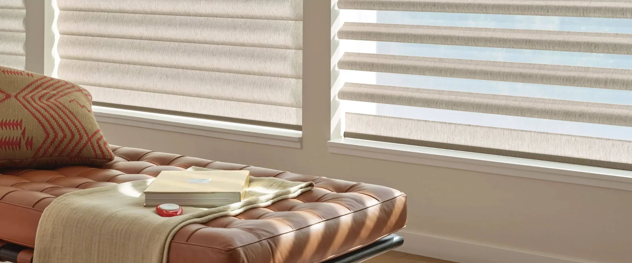 Drapery-like sheers create a soft glow while rotating fabric vanes provide privacy, UV protection, and flexible light control for large windows and doors.