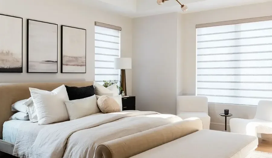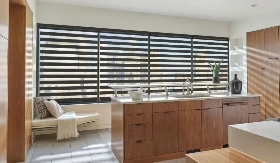 Layered sheer and solid fabric bands create modern dimension, allowing you to shift effortlessly between filtered views, soft light, and enhanced privacy.
