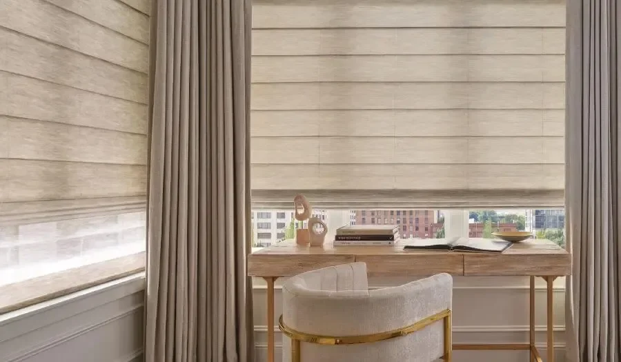 Elegantly tailored Roman shades in flat or full folds soften light beautifully, offering refined style, energy efficiency, and flexible light control with luxurious fabric options.